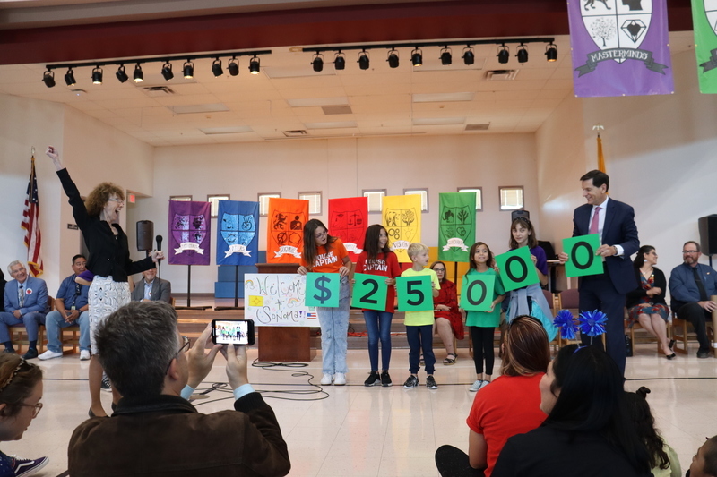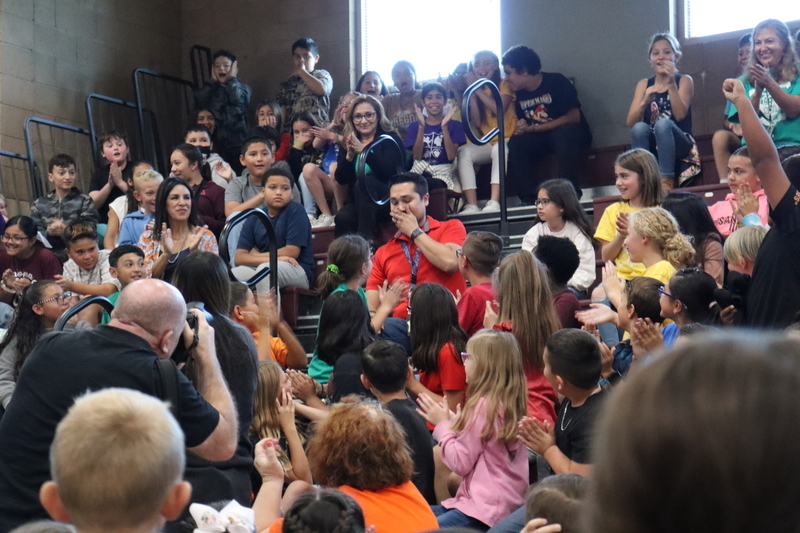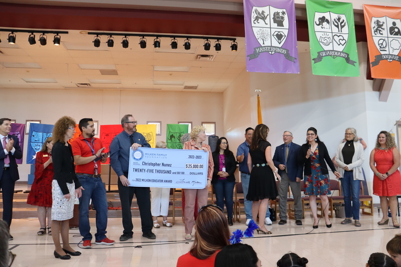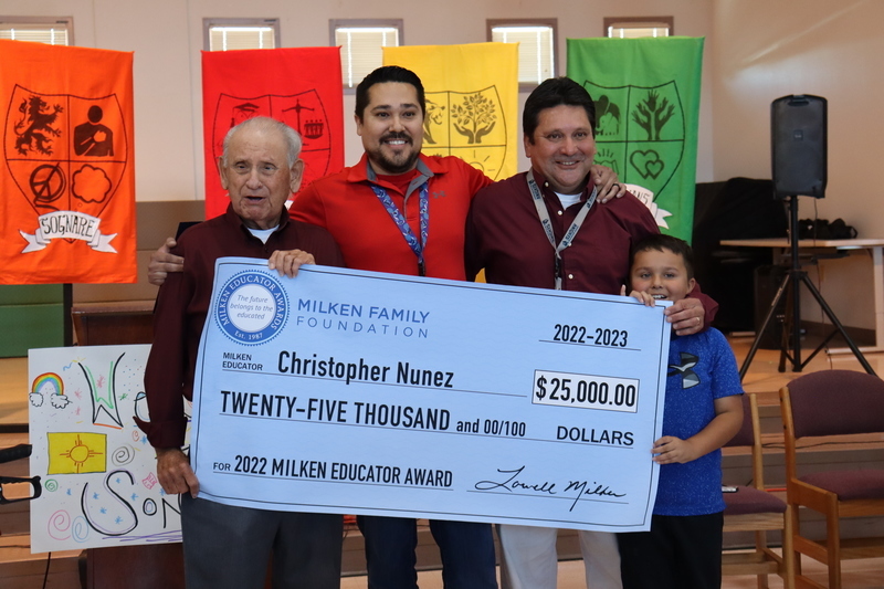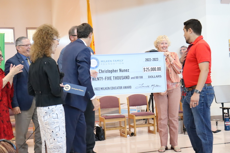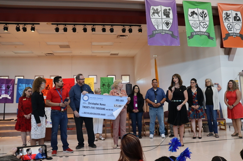 LAS CRUCES, N.M. — For Sonoma Elementary School fourth grade teacher Christopher Nunez, education has been a part of his life since he was a young boy. Both Nunez' parents teach in Las Cruces' public schools, and when he went to college, he followed their footsteps and studied elementary education. Today, this family legacy of education was honored as Nunez was surprised at a schoolwide assembly of cheering students, appreciative colleagues, local dignitaries and media with the $25,000 Milken Educator Award from the Milken Family Foundation